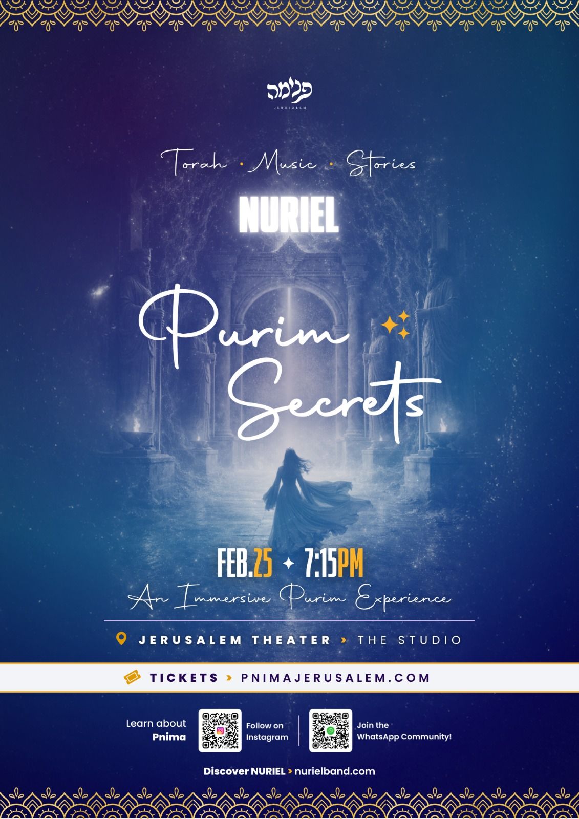 Purim Secrets (Tickets here) Join Pnima and Nuriel on February 25th for a powerful pre Purim immersive experience at the Jerusalem Theater, an evening of Torah, music, and stories that open the heart and prepare us to enter Purim with depth and joy. Tickets available here. To learn more about Pnima, join the WhatsApp group or visit www.pnimajerusalem.com.