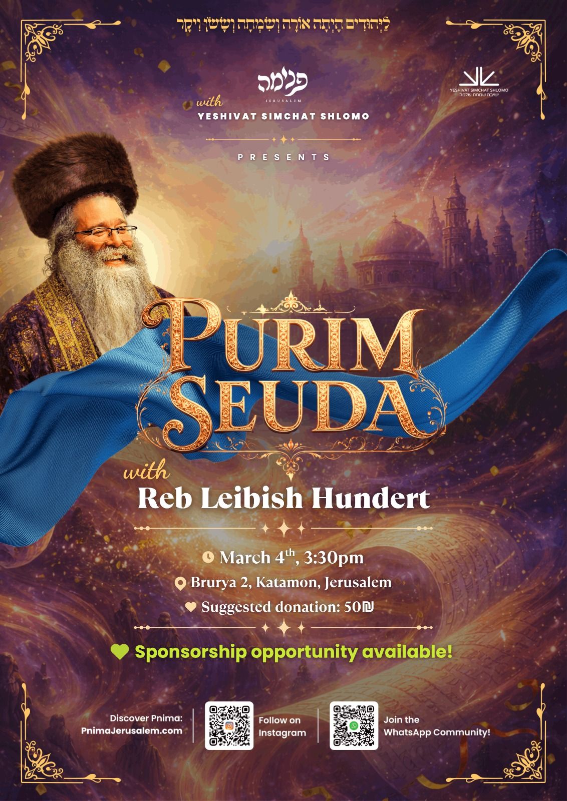 ✨🎭 Purim Seuda at Pnima led by Reb Leibish Hundert of Yeshivat Simchat Shlomo (Details here) ✨🎭 - Join Pnima and Yeshivat Simchat Shlomo for a Purim Seuda you’ll never forget. It will be an afternoon of joy, niggunim, laughter, and deep purim light. Starting at 3:30pm at Pnima Jerusalem (Brurya 2, Katamon). Suggested donation: 50₪ and a bottle of wine 🍷. To learn more about Pnima, join the WhatsApp group or visit www.pnimajerusalem.com.