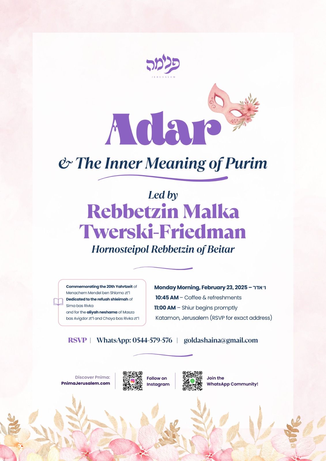 Adar & The Inner Meaning of Purim Womens Shiur with Rebbetzin Malka Twerski-Friedman, Hornosteipol Rebbetzin of Beitar @Pnima in Katamon (details & RSVP here) - A special shiur for Rosh Chodesh Adar - Adar & the Inner Meaning of Purim. Led by Rebbetzin Malka Twerski-Friedman, Hornosteipol Rebbetzin of Beitar, a beloved Torah teacher of over 30 years who gives shiurim in the Old City, Rechavia, Beitar, Katamon and beyond. With warmth, depth, and chassidic wisdom, she brings Torah to life and inspires women of all backgrounds. Monday Morning, 10:45 refreshments, 11am shiur. RSVP for address. To learn more about Pnima, join the WhatsApp group or visit www.pnimajerusalem.com.