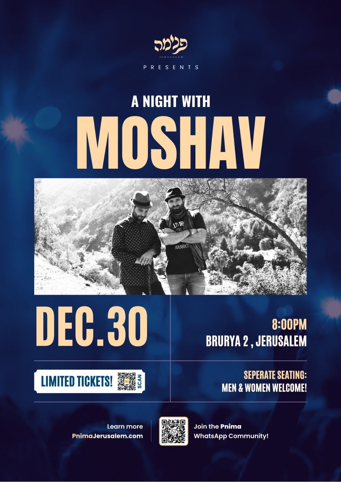 A Night with MOSHAV (Tickets here) - Join Pnima for a special evening with Moshav—an intimate and uplifting night of music, light, and soulful energy in the heart of Katamon, Jerusalem. Experience the unmistakable spirit that has made Moshav beloved around the world. Seating is separate, and men and women are welcome. Tickets are very limited. To learn more, join the Pnima WhatsApp community or visit the ticket link here.